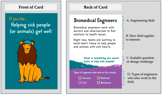 Due to differing institutional and learner needs, the activities were designed to be flexible in terms of duration. Each engineering activity was scaffolded so that it could be completed in as little as five minutes or expanded to take an hour or longer. This was done to accommodate both the needs of the institutions and the learners. Returning to the example of You are an Engineer (see Figure 3), participants look at the front of a series of cards and select all the activities that align with their interests. They then flip the cards over to reveal information about the associated engineering field, and tally their “score” for each type of engineer listed at the bottom of the card to see which engineer they are most like. This activity is flexible in two ways. First, the cards’ written content was co-developed with graphic designers to create visual hierarchy that allows users and facilitators to easily filter in and out components based on learner ability. For example, a new reader or young learner might focus heavily on element A with some exploration of element B, whereas a more advanced learner might engage in a more robust discussion that includes debating the categorization used in D or brainstorming the question posed in C. Second, activity extensions include turning the questions posed in C into full design challenges and links to pre-existing design challenges and laboratory experiments aligned with each type of engineer listed on the cards. In this way, these activities have been designed to be adapted for all ages and the full gamut of the science museum experience.