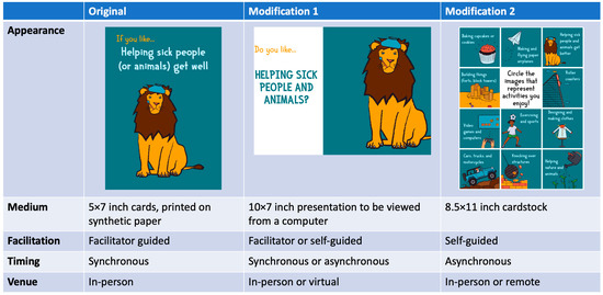 Three EEK! trainings were completed in January of 2020 and the kits were distributed in early February. This gave many museums just a few weeks to use EEK! before they began reporting layoffs and closures in March. Rather than put the kit on hold indefinitely, the EEK! development team worked with the adopting museum partners to rapidly adapt it in three key ways. First, given the unprecedented nature of COVID-19 and the variation in state responses across the nation, we convened community check-ins, which began as bi-monthly meetings for any kit recipient organizations’ staff members, as well as other informal education professionals who expressed interest. These were reduced to monthly check-ins in July. We adopted this active support model of innovation dissemination because it was a natural continuation of the collaborative chain-link process used to design the kits, and because an active technical assistance or consultation approach has been shown to lead to greater implementation success [58,71]. Second, since many of the participants had scheduling conflicts with the community check-in, we produced a monthly newsletter. This active support feature also allowed the participants to disseminate information about the EEK! program more broadly within their home organizations and to their partners. Finally, operational modifications were made to EEK! structures and layouts to better accommodate socially distanced informal education, which included virtual video-based learning, as well as physical take-home kits that the museums were creating. Some of these modifications were small shifts (see Figure 4 for sample shifts); however, they created pathways for use that would not have otherwise existed. In contrast, other modifications were more robust, such as the creation of a heartrate-focused scavenger hunt or co-created modifications to support use in in-patient mental health facilities, where many materials such as pens and paperclips are prohibited.