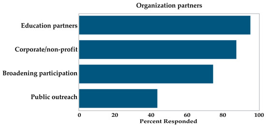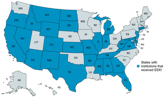 The current study uses an exploratory and descriptive research design, combining qualitative and quantitative methods, to examine the impact of social disruptions on museums and the role of partnership-based, co-created programs in their efforts to adapt to those disruptions, using the EEK! program as a case study. EEK! was developed, implemented, adapted, and evaluated over a 2.5-year period, with program development beginning in 2018. The program was officially launched in early 2020 and evaluation data were collected in Fall 2020 (see Figure 1). In what follows, we focus on the 37/51 institutions that received EEK!, responded to the survey, and consented to share their experiences during the first six months of a global pandemic. A 29-item survey was distributed to key museum staff at the 51 EEK! partner institutions as part of EEK! program evaluation. It is important to note that the decision to survey museum staff rather than EEK! participants was informed by an understanding of important considerations and challenges associated with evaluations of informal engineering education [72,73] (Fu et al., 2019; Teasdale, 2022). In particular, there are concerns about ecological validity, as many traditional education evaluation methods violate the very principles that make informal education valuable. For example, pre–post tests, interviews, and formal surveys administered to students are considered to be disruptive to the engaged nature of informal learning contexts [20].