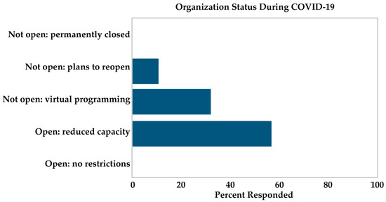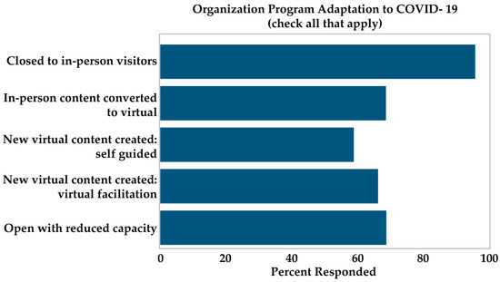 In order to address RQ1, survey respondents were asked about the ways in which their organization had been impacted by the pandemic. At the time of data collection, 57% of respondents indicated their institution was open to in-person visitors but operating at a reduced building capacity. However, 32% of respondents indicated that their institution was not currently open to in-person visitors, but had adapted by hosting virtual activities and programs. The remaining 11% of respondents reported that their organization was not currently operating due to COVID-19, but had plans to re-open in the future (see Figure 7). It is important to note that none of the survey participants indicated unrestricted operations, showing that none of the involved museums remained untouched by the impacts of COVID-19. Alternatively, no respondents indicated that their organization was no longer in business, which is reassuring when many organizations had to permanently shut their doors during the pandemic. It is worth noting that similar results were found by the American Alliance of Museums (AAM), who conducted a real-time analysis of the impact of COVID-19 on museums during the pandemic. Specifically, they found that 98% of museums closed at some point in 2020, and 29% were closed as of late October 2020 [76].