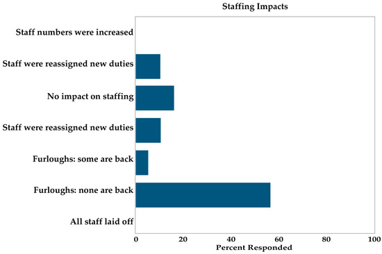 With all respondents indicating changes in operations due to COVID-19, it is imperative to acknowledge what this meant for the organizations’ staffs. AAM’s survey [76] found that 53% of museums reported furloughs or layoffs; however, our sample experienced higher rates of staff reduction. A majority of the responding organizations (57%) reported that layoffs occurred in light of the operation changes, with only 16% of respondents indicating that operation changes had had no impact on staffing (see Figure 8). Moreover, 16% of museums reported furloughs, with 11% reporting only some employees currently back working, and 5% reporting all employees back working. This means that 73% of the museums involved in our study were working with a reduced staff at some point compared to pre-COVID-19 times; meanwhile, job demands are arguably higher with the large need to make significant changes and adjustments to operations in light of the COVID-19 pandemic.