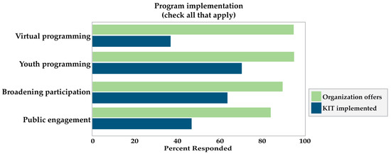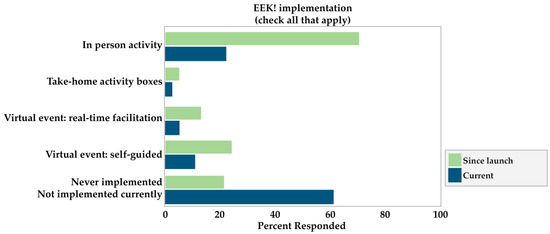 Despite these disruptions from COVID-19 restrictions, the vast majority of respondents, 78%, reported implementing EEK! at some point (see Figure 10). Nevertheless, more than half of the respondents (62%) reported they were not currently implementing the kits at the time of data collection. This aligns with AAM’s [76] finding that 67% of the survey respondents were forced to reduce their educational offerings, programming, and other public offerings due to limitations related to reduced budgets and staff capacity. This demonstrates that critical informal learning activities were restricted, hampered, and deprioritized during COVID-19—a problem that should not go unrecognized.