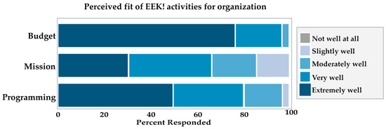 Many museums’ efforts towards finding new creative ways to offer programming were directed at EEK!, in co-creation with the EEK! design team. Despite most of the respondents reporting that the kits fit very or extremely well (on a 5-point Likert scale: 1 = not well at all, 5 = extremely well) within their organization’s budget, existing programming, and overall mission (see Figure 11), adaptations were encouraged given the diversity of needs and environments of the adopting organizations and, especially so, given the ever-changing circumstances of a global pandemic. To further understand program implementation and adaptation, we asked respondents about changes they made to the kits, as well as their utilization of the resources available through the university–museum partnership to support program adaptation.