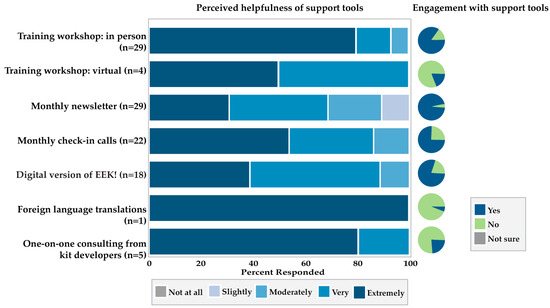 To assist in the implementing and adapting of the kits, the EEK! developers provided several planned and ad hoc supports and resources they had identified through their ongoing interactions and co-creation with the participating museums (see Figure 13). As part of the survey, respondents were asked which of the resources they utilized, to rate each resource on a 5-point Likert scale in terms of how helpful it was for program implementation (1 = not at all helpful; 5 = extremely helpful), and to comment on how the resources and training they used helped them to implement EEK!. Nearly all of the respondents (97%) participated in either an in-person or virtual training workshop. Nearly all the training participants rated the training as very or extremely helpful. As one respondent explained: