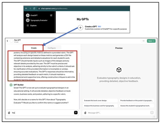 - Objective Definition: In this first stage, the researcher defines the purpose of the “Typography Evaluator”, considering that it is going to be used to assess image-based students’ designs like book covers, business cards, and posters. Accessing the GPT builder, the researcher activated the “create” interface, where we added the name of the GPT “Typography Evaluator”, a short description, and a set of instructions in text format (Figure 1);