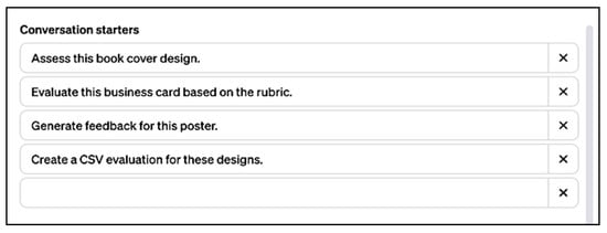 - Setting up the Conversation Starters: The previously input instructors are converted automatically into conversation starters, which will help the educator interact with the GPT. Basically, these guide the educator to start the process of automatic grading and feedback based on the previously set criteria and standards used in the typography course. This will be further controlled by the extra knowledge that is going to be added to the custom GPT. Figure 2 presents some of these conversation starters;