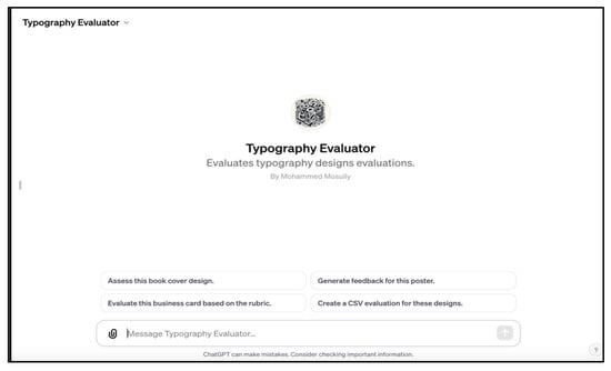 In late November 2023, the custom GPT feature was rolled out for Plus users of OpenAI services. A user can train a custom GPT on their data, incorporating the basic capabilities of the GPT-4 like image generation, internet browsing, and data analysis to perform a specific task. Therefore, the researcher utilized the custom GPT feature to create a “Typography Evaluator” GPT, which is used to generate automatic grading and feedback on the typographical designs produced by the participating students. To achieve this objective using this custom-designed GPT, the researcher input grading the rubric in addition to an evaluation/feedback form, which must be used by the “Typography Evaluator” to grade students work considering the elements of typefaces, format, and color use, then generate suitable and informative feedback.
