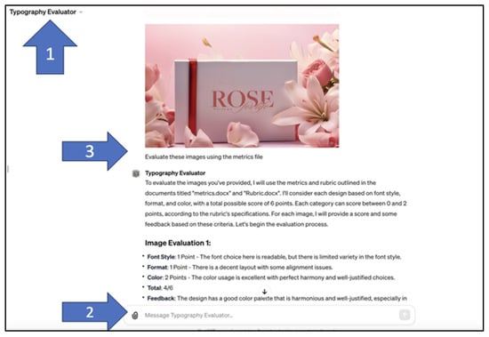 Figure 8. Guides of using Typography Evaluator interface. Select model by choosing the custom ChatGPT model (Arrow 1), Upload image for evaluation (Arrow 2) and View results in the designated area for results (Arrow 3).