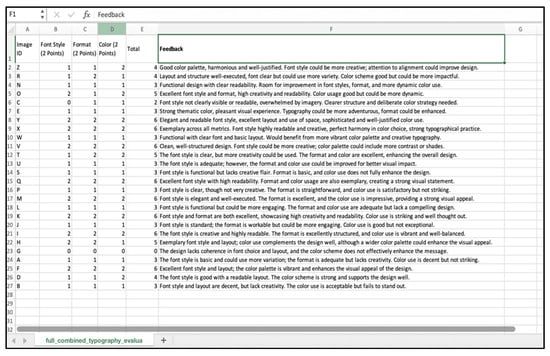 The automatic grade/feedback cycle with the “Typography Evaluator” lasted for 30 min, spent on uploading the 25 images (10 per batch) and then generating and exporting the grade/feedback report in .csv format. This evaluation process resulted in three assessment reports, including the grading for each design criterion, a total grade, and a feedback statement.