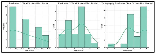 As the scored elements in the evaluation reports are numerical values contributing to a total grade, the initial stage of the analytical process adopted in this research highlighted the importance of testing the normality of data distribution for each evaluator. This step determines the type of statistical techniques to be used to test the significance of differences between evaluators (Figure 10). So, the Shapiro–Wilk test is implemented on each evaluator’s dataset to compute the p-value. Ideally, if this value is below the alpha threshold of 0.05, this would indicate a significant divergence from normality. When applied in the research context, it revealed that the total scores coming from the reports of all evaluators did not follow a normal distribution. Table 4 shows the p-values for Evaluator 1, Evaluator 2, and Typography Evaluator, which scored 0.0008, 0.049, and 0.0027, respectively. This demands the implementation of non-parametric tests in further analyses.