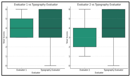 The results of the tests revealed that for the “typeface” aspect, there is no statistical significance between the three evaluations because the comparisons’ p-values between Evaluator 1 and the Typography Evaluator (=0.865) and Evaluator 2 versus the Typography Evaluator (=0.309) are above the 0.05 threshold.