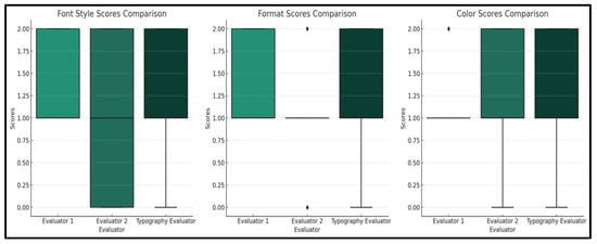 Considering the insights reported in Table 6 and Figure 12, it could be assumed that both human and AI-based evaluations showcase mostly similar scoring mechanisms for the design aspects of typeface and color in the assessed projects. It is only when considering the element of format assessment by Evaluator 2 in comparison to the Typography Evaluator that one notes a significant difference, which is indicative of evaluation variability.