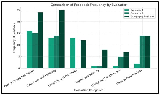 To investigate the educators’ as well as automatically generated textual feedback, the researcher conducted quantitative content analysis to identify the most frequent themes or topics in these feedback snippets []. Basically, the first step in this structured approach entails creating several overall categories (or themes) that will be the focus of the investigation. Then, the numerical frequencies for those themes as word representation are computed using ChatGPT for both the human evaluators and the Typography Evaluator. Finally, a comparison of each category representation per evaluator is conducted to discover similarities and differences in the quality of offered feedback.