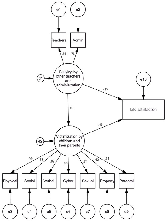 Standardized results of the model of associations between teacher victimization by staff, victimization by children and their parents, and life satisfaction.