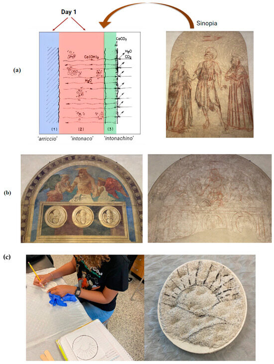 Day 2 design. Sinopia are the underdrawings of a fresco: (a) lecture component of Day 2: discussion of the design process with examples of sinopia and fresco; (b) sinopia at the convent of Sant’ Apollonia, Firenze, Italy, was discovered during the conservation of the fresco; (c) students designing their own sinopia in the experiential component of Day 2.
