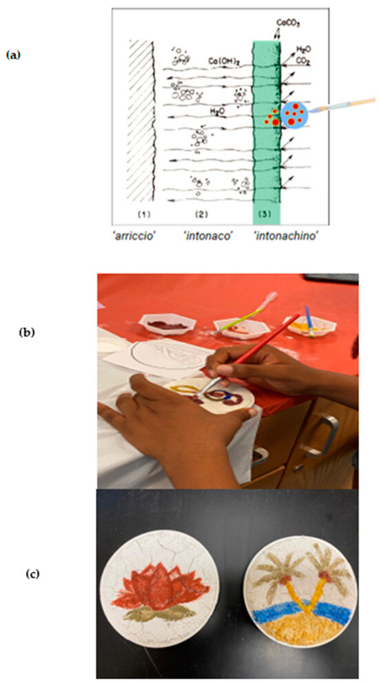 Day 4 experiential learning activities of the CReST curriculum: (a) schematic of the pigments suspended in acqua di calce (lime water) as applied with a paint brush; (b) a student painting their designed fresco with pigment; (c) two examples of student fresco paintings.