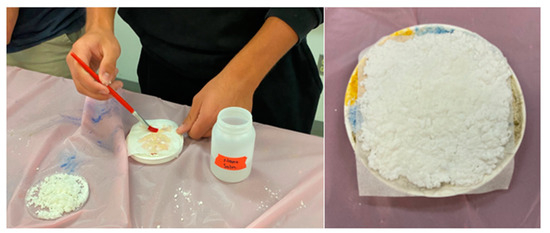 The students explored the fresco-making process through the chemical composition of the building material. To prepare fresco underlayment, calcium oxide (CaO), or ‘calce viva’, is manufactured through the thermal decomposition of natural materials such as limestone or seashells, which contain calcium carbonate [40]. With cement as the foundational material of the cultural heritage artifact, the fresco, Day 1 integrated relevance through discussion and calculations of the endothermic cement manufacturing process with the annual world energy consumption. Experientially, the students prepared the first layer of their fresco underlayment, arriccio, by mixing grassello (hydrated lime putty) and sand (Figure 4).