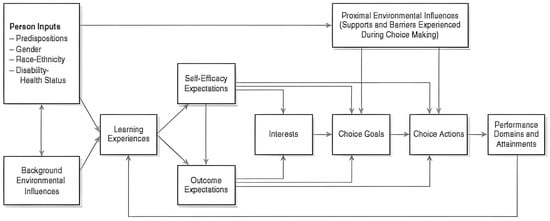 SCCT (social cognitive career theory) stems from A. Bandura’s self-efficacy theory and general social cognitive theory, developed due to his discontent with behaviorism and psychoanalysis. It presents a significant conceptual and theoretical framework, delving into factors that affect the cognitive process of educational and career decision-making [1,2,3]. Unlike behaviorism and psychoanalysis, which often overlook the role of cognition in motivation and the impact of situations, SCCT thoroughly addresses these aspects [4]. Lent, Brown, and Hackett [5,6,7] are credited with developing and formulating this theory. Based on these researchers, it is crucial to consider the influence of individual and intra-personal circumstances on achieving positive outcomes related to external situations, which are closely tied to one’s belief in their own abilities, often referred to as “self-efficacy”. A. Bandura was the first to propose “self-efficacy” as a term, and by then it had been extensively discussed in various studies, including those on social learning theory [8,9,10,11,12,13]. However, numerous other researchers have also conducted investigations on “self-efficacy” [14,15]. The concept of “self-efficacy” or “self-efficacy expectation” can also be explored in the social cognitive theory of behavior [16,17], examining an individual’s capacity to shape their own actions (human agency). Bandura’s theory highlights the significance of indirect learning, specifically through observational learning, as a means of acquiring knowledge. This form of learning involves observing others and might potentially affect socio-cognitive mechanisms’ development that enable individuals to modulate their behavior, thereby influencing their future success or performance.