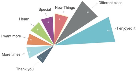 Sixteen participants were chosen to respond to the focus group; all of them provided positive feedback on the activities carried out, saying that it was a different day, fun, and special, among other words. These 16 and the remaining 38 children were asked to summarize the activities in a few words. The summary of the answers can be seen in Figure 2 below.