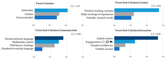 Utilizing an AHP model, it was generally observed that in tweets, teachers prefer interaction over content and find communication to be least important. Content refers to the subject matter and topics of the tweets. Communication, in this context, is less about the interaction itself and more about how information is presented within the tweets. In this context, interaction refers to preferences such as direct engagement with others under tweets or linked content that directs interaction to other websites. This highlights a significant need for action in science communication, since teachers desire interaction with universities, yet university tweets are seldom dialogue-oriented, mostly being self-referential [5,6]. There are already several models on how researcher–teacher relationships can be formed to encourage teachers’ adoption and implementation of research findings [96], which this study builds upon and contributes to. Methodologically, it should be noted that the response behavior at this level (2) was inconsistent. Some teachers’ responses significantly favored communication over interaction, making the mean decision highly subjective. Employing an algorithm in subsequent analyses to adjust this inconsistency might be beneficial [97].