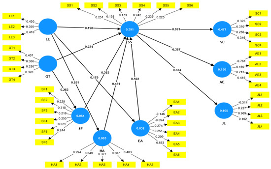 To establish discriminant validity, the researcher used a heterotrait-monotrait correlation ratio (HTMT), which is preferred to the cross-loading assessments and the commonly used Fornell–Larker criterion [86]. According to the results in Table 4, all HTMT values for the latent variable are inferior to 0.90, except the values for HA adjustment and emotional adjustment.