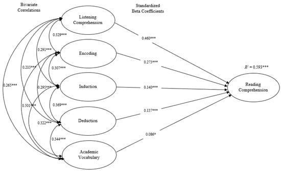 * p < 0.05; *** p < 0.001. Measures predicting reading comprehension show bivariate correlations, standardized beta coefficients, and total explained variance (R2).