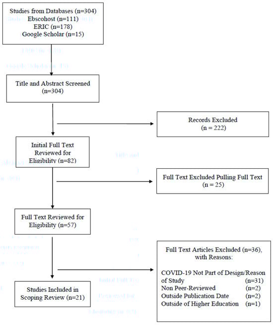 The initial search yielded 304 results, with no duplicates between databases. In our screening process, publications were excluded if they were (1) not open access, (2) not published in English, (3) not peer-reviewed, (4) not on the subject of IVE, (5) not directed related to a higher-education setting, or (6) did not address new or expanded applications of IVE due to COVID-19. Our criteria to only include open-access, peer-reviewed work was guided by [7] recommendation on open educational resources, which affirms the right of all people “to seek, receive and impart information and ideas through any media and regardless of frontiers, as well as the right to education (Article 26)”, in the Universal Declaration of Human Rights. As an emerging medium and given inequities that currently exist in international education broadly, access to resources is necessary for more equitable awareness of IVE and effective practices for program development and implementations. While refining the search beyond publications utilizing English as a lingua franca would further these aims of equity, this was beyond the capacity of the current research team. Our hope is that this scoping review will connect with future discussions of IVE that extend these aims.