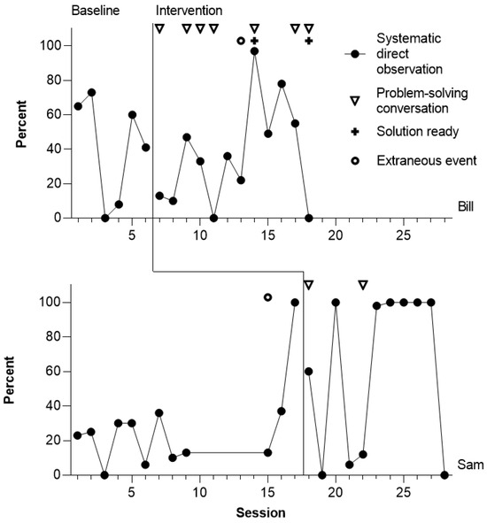 Interobserver agreement data were collected by two independent observers for 83% of the observation sessions for Bill (67% during the baseline and 91% during the intervention phase) and in 86% of observations for Sam (82% during the baseline and 91% during the intervention phase).