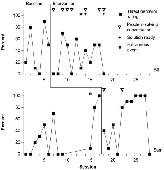 Second, the extraneous events that occurred during the intervention phase for Bill and during the baseline phase for Sam may have contributed to their off-task behaviours beyond the intervention, per se. As seen in Figure 1 and Figure 2, during intervention sessions 13 and 14, Bill was told that he would remain in the alternative setting. This made him upset and may have led to an increase in his off-task behaviour, according to the teachers. Although alternative settings have more resources than mainstream settings to provide support to students with behavioural problems, these settings are often associated with stigma and have “negative connotations” [36,37], which may have been the issue in Bill’s case. Sam received a new smartphone during session 15 of the baseline phase, which made it difficult for him to stop playing games when lessons started. There may be a complex interaction between multiple factors that contribute to disruptive behaviours [3]. These factors are difficult to predict, but they may need to be taken into account when planning and evaluating CPS interventions.
