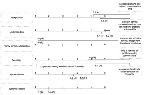 Figure 4 shows the teacher assistant’s ratings of the usability of the CPS intervention with the mean score for each of the six factors of the URP-IR and URP-A scales. The results of the acceptability, understanding and feasibility subscales were high, indicating that the teacher assistant considered herself highly knowledgeable about the intervention and assessment procedures and perceived them as possible to implement given the existing demands. The teacher assistant stated that the ALSUP often contributed to better understanding and empathy for a student among teachers, e.g., “It is sometimes the case that after ALSUP meetings, some teachers feel ashamed about talking negatively about a student’s behaviour; you can feel empathy in the air”. According to the teacher assistant, problem-solving conversations were valuable in supporting the problem-solving skills of students, e.g., “the great advantage is that students learn to solve problems, which can be useful later in adult life”.