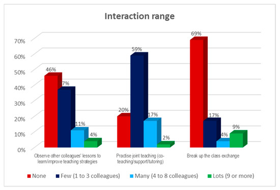 However, we also found that collective learning is the dimension with the lowest average, which may be partly explained by the low frequency (number of times it occurs) and breadth (number of colleagues with whom it occurs) of more complex professional interactions such as lesson observations, joint teaching and class exchanges, as illustrated in Figure 2 and Figure 3.