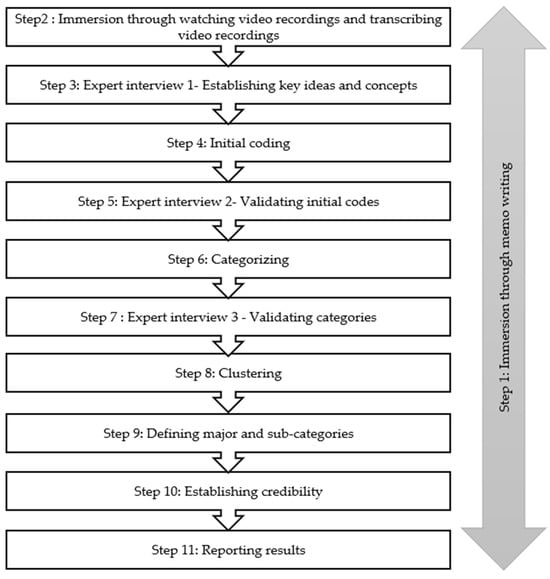In QCCA, data analysis is conducted in the following steps: immersion, initial coding, categorising, clustering, defining categories, reporting the findings, and memo writing [57]. In this study, four additional steps were added to enhance the validity of the findings. Three experts were consulted, one after each step in the analysis, to provide clarity and validation for the emergent codes, and three senior researchers assessed the data audit trail for credibility. The analysis procedure is duplicated in Figure 1.