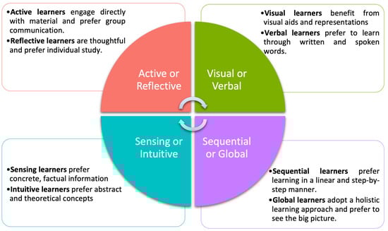The Felder–Silverman learning styles model (FSLSM) [17] was developed by Richard M. Felder and Linda K. Silverman in 1988 and is commonly referred to as the Felder–Silverman model or simply the Felder–Silverman learning styles. This model suggests that individuals have different patterns of preferences and tendencies in the way they learn and process information. The FSLSM proposes four factors or dimensions, with each dimension being an opposing pair of categories that represent an individual’s preferred approach to learning (see Figure 1). A person’s inclination toward one category over another can vary in intensity, ranging from strong to moderate to mild. This preference strength, and possibly the preference itself, is not permanent, but it can evolve with the person’s education, life experiences, and the specific subject or context of instruction [20].