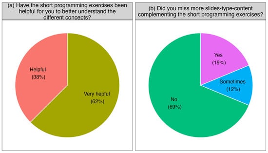 Figure 2. Students’ perceptions of the helpfulness of the short exercises and live coding demonstrations interleaved during the lectures (a). Students’ answers regarding whether they missed more theoretical content supporting short exercises and live coding demonstrations (b).