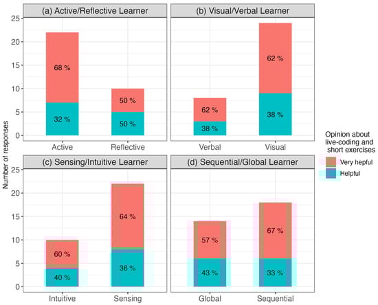 Students were asked about the perception they have regarding the use of short exercises and live coding demonstrations interleaved during the lectures. As shown in Figure 2a, all of them thought they were helpful (38%) or very helpful (62%). We also examined if these answers were impacted by each learning style dimension. Figure 3 shows the distribution of these answers grouped by the different learning style dimensions. For example, Figure 3a displays how active vs. reflective learners perceived the benefits of live coding and short exercises in the course. Students who identify themselves as active learners thought, in a higher proportion, that live coding and short exercises were very helpful, while around half of the students identified as reflective learners were not as positive.