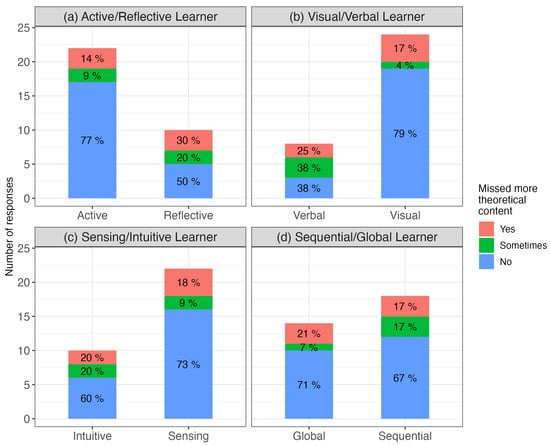 Although live coding and short exercises are clearly helpful for students, theoretical content about the main concepts of object-oriented programming, such as inheritance or encapsulation, was also provided in the course. In the survey, students were asked if the balance between live coding/short exercises and theoretical content was adequate for them or if they missed the use of more theoretical content. As shown in Figure 2b, almost 70% of them did not miss more theoretical content (i.e., the balance was satisfactory), while the rest of the students missed it to varying degrees (answers “yes” and “sometimes”). As before, we also examined if these answers were impacted by each learning style dimension. Figure 4 shows the distribution of these answers across the different learning style dimensions.