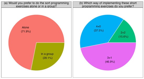 Figure 5. Students’ preferences about performing coding exercises alone or in groups (a). Students’ preferences about the distribution of time within a four-hour session (b).