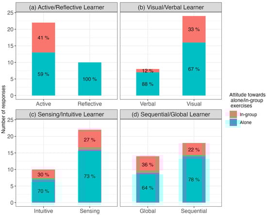 Figure 6. Students’ preferences of performing short exercises alone or in groups by learning style dimensions.