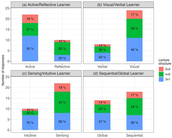 Within this approach, distinctions in preferences became evident between the 3+1 sessions (3 h of lecturing/live coding/short exercises + 1 h of group exercises) and the 4+0 sessions (4 h of lecturing/live coding/short exercises, excluding group exercises). The 4+0 session was the preferred option among reflective (60%), sensing (45%), and sequential (44%) learners. Conversely, the 3+1 session was widely accepted among active (55%), intuitive (70%), and global (57%) learners. Both visual and verbal learners leaned towards the 3+1 session, with 46% and 50% of responses, respectively.