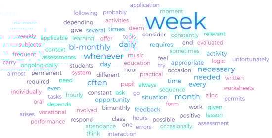 For item number 13, we were interested in capturing the frequency that teachers apply when providing feedback. Their responses were then analyzed and coded using the online software https://monkeylearn.com/, accessed on 4 December 2023. We mapped the words that were most frequently mentioned by respondents (Figure 2 below presented). A percentage of 53.0% was registered by choosing the option “once a week”. Other words that were registered are “once a month or monthly, once a week, daily, whenever it is needed, constant, when the situation calls for it, during every activity, depending on, several times a week”, indicating strong correlations among respondents’ questionnaire replies, the frequency of providing feedback to students, and active students engagement.