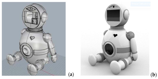 (a) Emorobot design through CAD software; (b) rendering of the robot prototype.