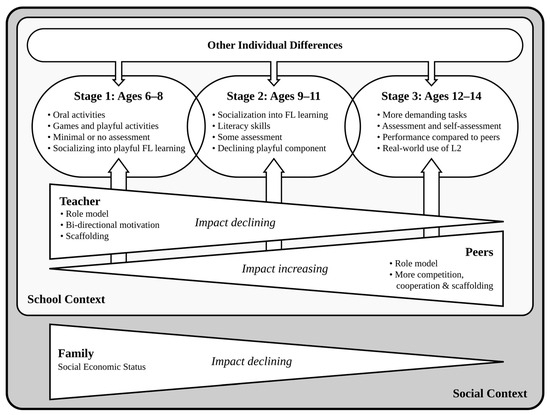 While these models are well established within the theoretical frameworks of L2 motivation, they have been found to have limitations when applied to YLLs. Over the past decade, it has become increasingly evident that in early language learning, motivation is a distinctive phenomenon [20,28,29], requiring an eclectic perspective which combines variables from established models [39]. This perspective also considers learning conditions and the role of adults in children’s language learning experience. Mihaljević Djigunović and Nikolov [29] propose a framework for researching YLL motivation that considers its complexity and variability, addressing children’s developmental stages (Stage 1: ages 6–8, Stage 2: ages 9–11, and Stage 3: ages 12–14), the role of significant others (teachers, family, and peers), and the teaching and learning context (school and social environment) (Figure 1).