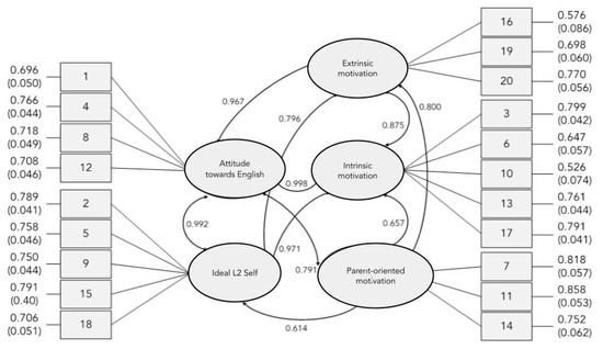 A Confirmatory Factor Analysis evaluated the internal dimensionality of Attitudes toward English, Ideal L2 Self, Extrinsic motivation, Intrinsic motivation, and Parent-oriented motivation using Weighted Least Square Mean and Variance Adjusted (WLSMV) as an estimator owing to items being ordinal variables. A six-factor model fitness was evaluated using χ2-test, χ2/df ratio that compensates the tendency of χ2-test to reject slightly misfitting models, Comparative Fit Index (CFI), Tucker-Lewis Index (TLI), Root Mean Square Error of Approximation (RMSEA) and a 90% confidence interval, and Standardised Root Mean-Square (SRMR) [61]. The following were used as cut-off values for an acceptable goodness of fit: χ2-test p < 0.005, χ2/df < 2, CFI > 0.95, TLI > 0.95, RMSEA < 0.06, and SRMR < 0.08 [69,70].