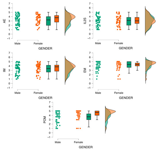 Statistically significant differences were found only between males and females in attitude towards English (AE) (W = 1488.5; p < 0.05) and parent-oriented motivation (POM) (W = 1218.5; p < 0.05), with females displaying higher scores than males, as depicted in Figure 5.
