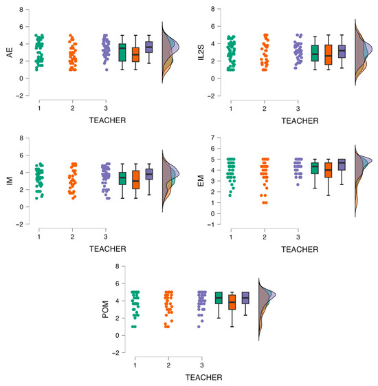 Regarding the differences by teacher, statistically significant differences were found in attitudes towards English (H = 7.996; p < 0.5) and extrinsic motivation (EM) (H = 9.44; p < 0.01), with students of Teacher 2 displaying significantly lower scores compared to those of Teacher 3, as shown in Figure 6.