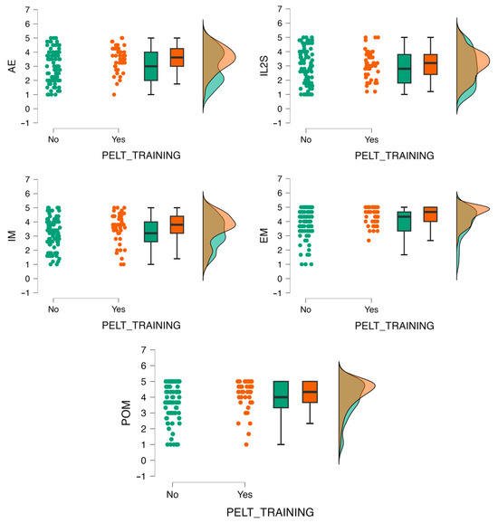 As for PELT training, statistically significant differences were observed in attitudes towards English (W = 1618; p < 0.05), intrinsic motivation (IM) (W = 1675; p < 0.05), and extrinsic motivation (W = 1535; p < 0.05). In these three factors, students taught by the PELT-trained teacher exhibited more positive attitudes, as illustrated in Figure 8 below. However, no significant relationships were found between attitude and motivation, and years of teaching experience.