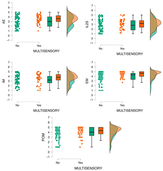 On the other hand, students whose teacher had access to multisensory materials displayed more positive motivation and attitude towards English in three of the five factors, attitude towards English (W = 1618.0; p < 0.05), intrinsic motivation (W = 1675.5; p < 0.05), and extrinsic motivation (W = 1535.0; p < 0.05), as depicted in Figure 9.