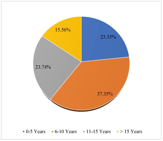 Figure 3 shows that the majority of respondents have work experience in the range of 6–10 years, with a frequency of 37.35% respondents. This is followed by respondents with work experience in the ranges of 11–15 years and 0–5 years, accounting for 23.74% and 23.35%, respectively.