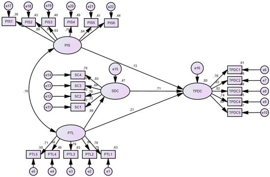 The following bootstrapping analysis was applied to assess the structural influence model of the direct and indirect effect of the variables examined and to determine the determinant factors (R2) [121,122]. Therefore, four variables are tested: PIS, PTL, SDC, and TPDC. The model analysis results are presented in Figure 4 and Table 5.