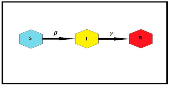 A major assumption of many mathematical models of pandemics is that the population can be divided into a set of distinct compartments. These compartments are defined with respect to disease status. The simplest model is the SIR model described by Kermack and McKendrick [22], which consists of the three compartments which are susceptible (S), infected (I), and recovered (R), where β is the transmission rate and γ is the recovery rate as shown in Figure 1.